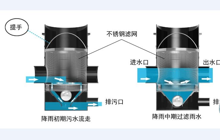 产品内置不锈钢挡板、控制弹簧、关闭控制球,挡板可以感应过来的雨水流量,当达到设定的降雨流量时,排污口自动关闭,停止排污,进行雨水收集。 在进行雨水收集时,内置了不锈钢过滤网可以对收集的雨水进行过滤,过滤产生的垃圾会留在排污口附近,降雨结束后,排污口自动打开,过滤的垃圾将随之排出,装置保持原有的状态。